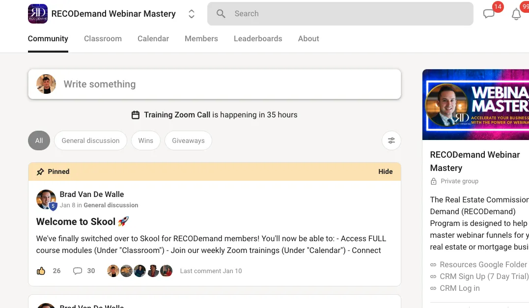 Check your email for the invite to the private Skool Community. This is where you'll find the Webinar Mastery Course , calendar for live Zoom trainings, and your free gifts.