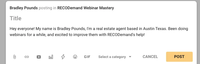Create a post introducing yourself. The market you service, whether you're a real estate or mortgage agent, if you're new to webinars/seminars or experienced.